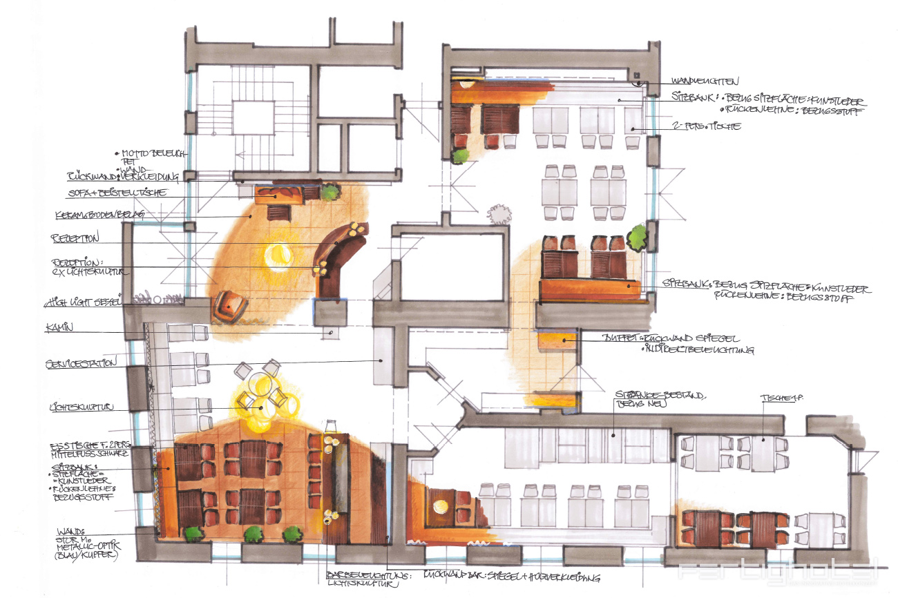 Durch Professionalität in der Planung, Kreativität im Design und Integration jahrelanger Erfahrungswerte verleihen wir den Vorstellungen des Kunden maßgeschneiderte Konturen. Um das entstehende Hotelobjekt visuell zum Leben zu erwecken, dienen Skizzen, Entwürfe und dreidimensionale Ansichten.