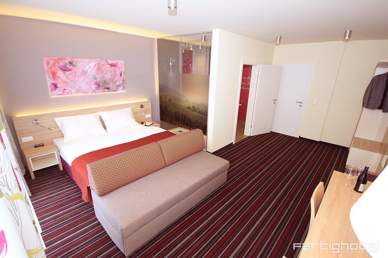Seit vier Generationen ist der familiengeführte Gasthof ein Genießer-Treffpunkt in der Thermenregion. Die frische Farbwelt aus Grün, Aubergine und Beige schafft eine gemütliche Atmosphäre. Passend zur Region zieht sich das Thema Wein nicht nur farblich durch das ganze Konzept: Von der Wandgestaltung bis hin zum Ausblick auf die Weinberge, Weinerlebnis auf der ganzen Linie! Eine Kombination aus Lärchenholz und einem warmen Gelbton hüllen die Zimmer im Hotel Keller ein. Die Fassade erstrahlt in frischen Farben, ein dunkelgrauer Streifen setzt einen Akzent zur Gliederung der Fassade. Ein besonderer Eyecatcher ist eine halbtransparente Wand im Badezimmer. Sie erlaubt einen Blick vom Bad ins restliche Zimmer. Die fließenden Übergängen lassen großzügige Räume entstehen, Platz zum Durchatmen und Genießen!